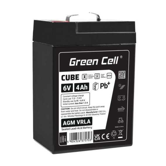Akumulator AGM Green Cell o napięciu 6V to wykonany z wysokiej jakości materiałów model przystosowany zarówno do pracy buforowej, jak i cyklicznej. Akumulator oparty jest na technologii AGM, co oznacza, że elektrolit wchłonięty jest w separator z włókna szklanego, co uniemożliwia jego wyciek. Dzięki temu akumulator może pracować w wielu pozycjach, nie tylko pionowej. Jest to świetna, znacznie bezpieczniejsza alternatywa dla akumulatorów kwasowo-ołowiowych.