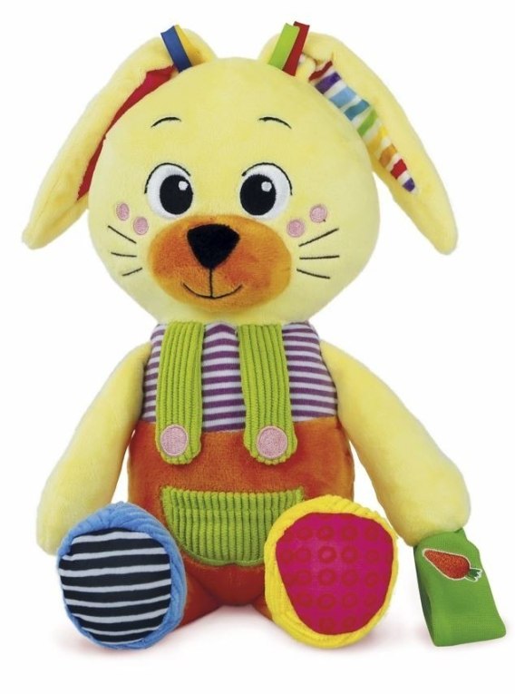 Słodki, mięciutki królik. Miękki i bezpieczny przyjaciel, idealny do przytulania i eksploracji. Pasek można wykorzystać do zawieszenia smoczka dziecka lub innego przedmiotu, który kocha. Marszczone uszy z materiału oraz różnego rodzaju najwyższej jakości tkaniny, które wspierają rozwój multisensoryczny. 100% można prać w pralce.