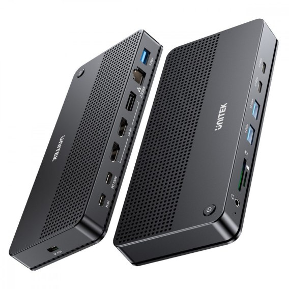 Sloty kart pamięci SD i Micro SD, trzy złącza wideo (2xHDMI i 1xDisplayPort), trzy złącza USB-A, dwa złącza USB-C złącze Jack 3,5 mm oraz Ethernet RJ-45 stacja dokująca Unitek ma wszystko, czego potrzebujesz, a nawet więcej! Zastosowano w niej w sumie 5 portów USB-C dwa do ładowania urządzeń, dwa do szybkiego przesyłania danych i ostatnie do podłączenia komputera.