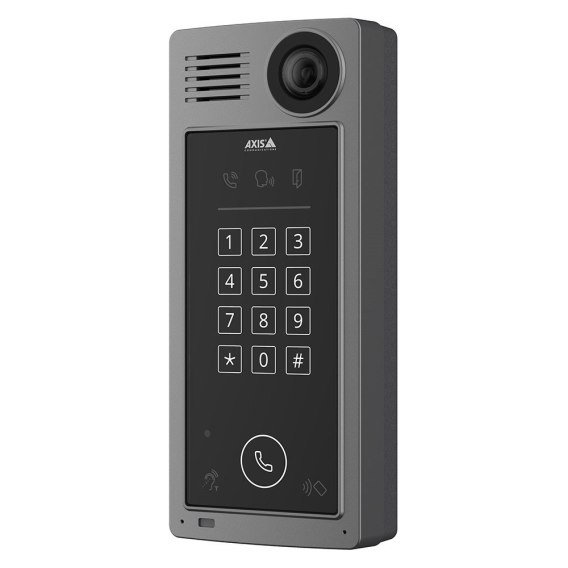 AXIS A8207-VE może również służyć jako czytnik kart i kodów PIN w celu wpuszczania pracowników i innych upoważnionych osób bez konieczności podejmowania innych działań. Nieznani odwiedzający mogą korzystać z klawiatury, aby zadzwonić do recepcji, osoby, którą odwiedzają lub pracownika ochrony, i poprosić o umożliwienie dostępu. Odbiorcy mogą wtedy zobaczyć odwiedzających, porozmawiać z nimi i otworzyć drzwi bezpośrednio lub zdalnie z dowolnego miejsca, w którym korzystają z telefonu komórkowego, telefonu IP lub systemu zarządzania dozorem wizyjnym.
