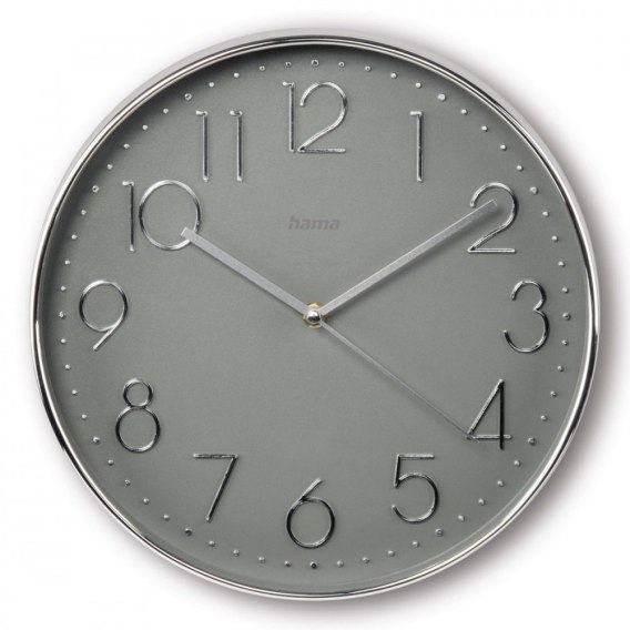 Szara tarcza o średnicy 30 cm i srebrna obudowa tworzą ponadczasowy wygląd. Duży analogowy wyświetlacz z wyraźnymi wskazówkami ułatwia odczyt godziny z każdej odległości, podkreślając jednocześnie elegancję wnętrza.