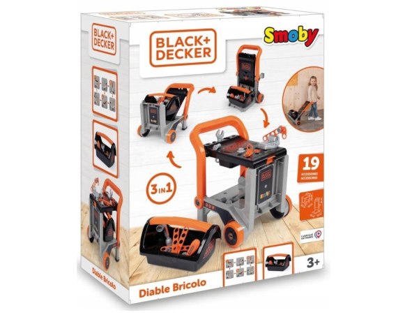 • Mobilny stół warsztatowy 3w1 od renomowanego producenta zabawek Smoby na licencji wiodącego producenta narzędzi Black+Decker to rozwijająca koncentrację zabawka dla każdego małego majsterkowicza, która łączy w sobie 3 funkcje: warsztatu, taczki i wózka.