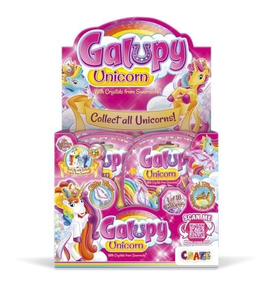 Galupy Skrzydlate Jednorożce to kolekcja flokowanych jednorożców w saszetce. Każda figurka jednorożca Galupy jest jedyna w swoim rodzaju i ma specyficzne cechy charakteru niektóre jednorożce Galupy mają nawet magiczne zdolności. Wśród nich jest jeden bardzo wyjątkowy Lilly, który nosi w swojej koronie nosi kryształ Swarovskiego.