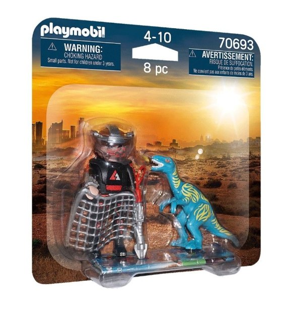 Playmobil Duo Pack zawiera figurkę mężczyzny, Velociraptora, siatkę, mini komputer, chwytak oraz opaskę na głowę