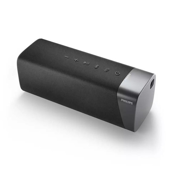 Głośnik wygląda świetnie w każdym miejscu. Wytłaczane przyciski umożliwiają sterowanie odtwarzaniem, funkcją Bluetooth i innymi funkcjami. Wbudowany mikrofon umożliwia prowadzenie rozmów przez zestaw głośnomówiący, a pasek do przenoszenia można przełożyć przez otwór na smycz.