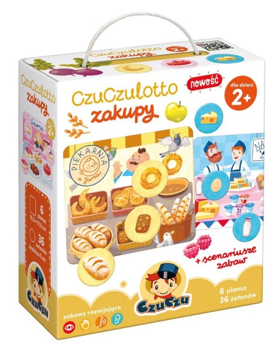 Edukacyjny zestaw zawiera 6 dużych kolorowych plansz i 36 żetonów, przedstawiających 6 różnych sklepów i smakołyki, które można w nich kupić. Do gry w loteryjkę chętnie zasiądą maluchy, starszaki i cała rodzina. CzuCzulotto sprawdzi się jako układanka, pierwsza gra dla maluchów i inspiracja do mnóstwa przeróżnych zabaw, na przykład w sklep i gotowanie. Mnóstwo pomysłów znajdziecie w poradniku, który dołączyliśmy do zestawu. Grajcie i bawcie się razem, doskonaląc przy tym przeróżne umiejętności.