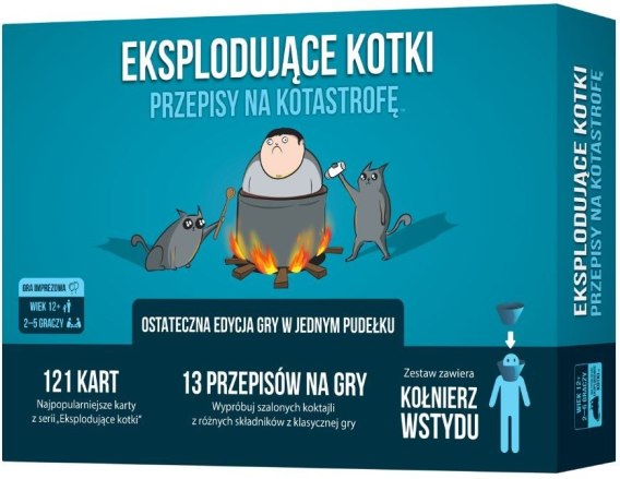 Niezależnie czy Twoja przygoda dopiero się zaczyna, czy też należysz do ich najzagorzalszych fanów serii, Eksplodujące Kotki: Przepisy na Kotastrofę zapewnią Ci wszystko, czego potrzebujesz do zgotowania najbardziej odjechanej rozgrywki! Zestaw zawiera 121 starannie wyselekcjonowanych kart zapewniających najwyższej jakości doznania, 13 nowych trybów rozgrywki, które zaskoczą nawet najbardziej wyrafinowanych graczy, a także sławny i niezwykle pożądany kołnierz wstydu.