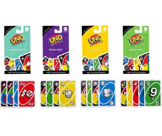 Dodaj karty specjalne z tych pakietów do klasycznej talii UNO i ciesz się rozgrywką w nowym stylu! W asortymencie jest pakiet Zmiana kierunku, w którym wszystkie karty odwracają kierunek gry, pakiet Dokładanie pozwalający graczom na dokładanie kar do innych kar, pakiet Wymiana kart do zamiany kart między graczami oraz pakiet Przyspieszenie umożliwiający graczom pozbywanie się kilku kart w jednej turze. Pakiety kart to świetny prezent dla fanów UNO i miłośników gier karcianych od 7 roku życia. Każdy zestaw sprzedawany jest oddzielnie, zależnie od dostępności. Kolory i elementy dekoracyjne mogą się różnić.