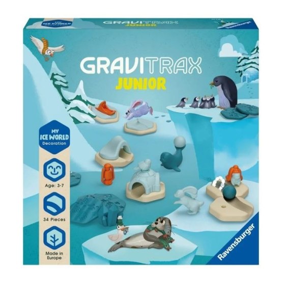 Zestaw uzupełniający Lodowa Przygoda jest rozszerzeniem do dowolnego pakietu startowego GraviTrax Junior. Do dyspozycji masz ponad trzydzieści różnorodnych elementów. Zbuduj tor, który wiedzie przez mroźne, arktyczne rejony! Plastikowa kulka biegnie pod igloo i lodową jaskinią, natykając się po drodze na zabawne zwierzątka!