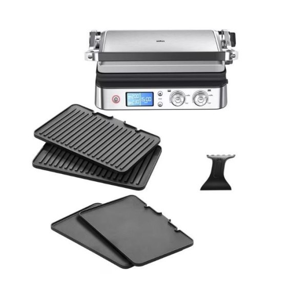 Doskonałe efekty grillowania na śniadanie, obiad, kolację i przekąski. Nieograniczone możliwości, którą zapewniają dwa zestawy różnych płyt i trzy pozycje grillowania na największej powierzchni roboczej Braun*. Moc 2000 W i wbudowane w płyty elementy grzewcze zapewniają szybsze pieczenie. Pokochasz tę szybkość i wydajność w swojej kuchni. A do aromatycznych, soczystych steków i chrupiącego, złocistego kurczaka wystarczy nacisnąć przycisk Sear, który dodatkową dawką mocy na kilka minut rozgrzeje grill do 250°C, tworząc intensywnie brązową skórkę, wzbogacającą wytrawny smak ulubionych mięs.