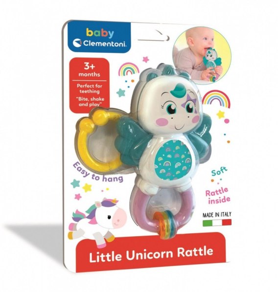 Skrzydła postaci wykonane są z miękkiej gumy do gryzienia. Zróżnicowane powierzchnie i materiały oraz grzechotka zawarta wewnątrz jednorożca wspierają rozwój multisensoryczny. Praktyczny uchwyt umożliwia łatwe zawieszenie w dowolnym miejscu.