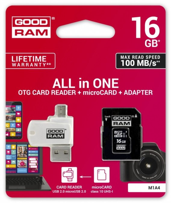 GOODRAM M1A4 to rozwiązanie łączące funkcjonalność kilku urządzeń w jednym. Jest to czytnik kart wyposażony w złącza USB 2.0 i micro USB, umożliwiające swobodne przenoszenie danych pomiędzy komputerami, smartfonami, tabletami, aparatami fotograficznymi oraz kamerami.