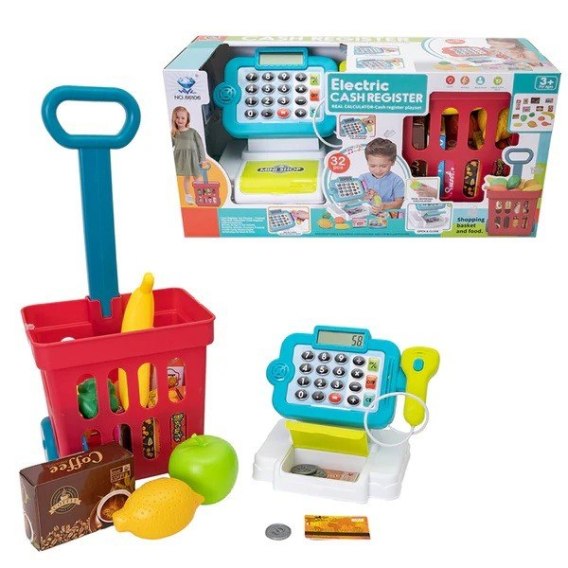 W zestawie kasa sklepowa z prawdziwym kalkulatorem oraz skanerem produktów oraz koszyk zakupowy pełen produktów spożywczych - owoce, warzywa, sok, kawa.