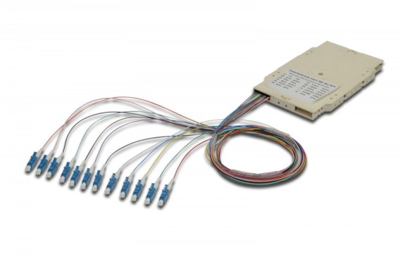 Kaseta spawów światłowodowych z 12 kolorowymi pigtailami LC (UPC), MM OM4 50/125, 2m