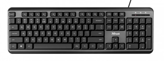 Kompaktowa i cicha klawiatura z pełnowymiarowym układem i konstrukcją odporną na zalania.