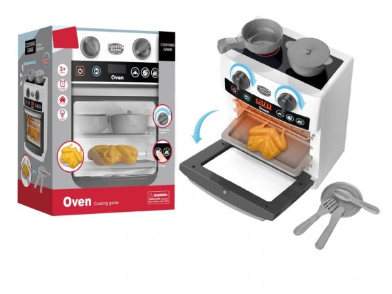 Poznaj kuchenkę z piekarnikiem, która imituje prawdziwe urządzenia AGD - świeci i wydaje realistyczne dźwięki. Po naciśnięciu przycisku ON i wybraniu jednego z trzech trybów rozpoczyna się świetna zabawa. Piekarnik się podświetla, a kuchnia zaczyna emitować autentyczne odgłosy. Na górze znajdują się dwa palniki i dwa pokrętła, które przy przekręcaniu wydają charakterystyczne kliknięcia.