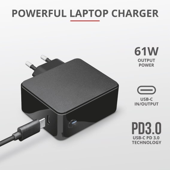 Łatwa w użyciu i niezawodna ładowarka do laptopa Trust Maxo 61W ułatwia ładowanie w parku. Dzięki 2-metrowemu kablowi USB-C zapewnia bezproblemową kompatybilność z Apple MacBook. Naładuj laptopa - lub dowolne inne urządzenie USB-C - szybko i stabilnie, aby szybko odzyskać pełną moc.