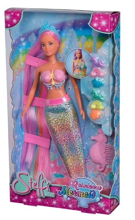 - DLA MIŁOŚNICZEK SYRENEK: Steffi tęczowa syrena umożliwia dziewczynkom ponieść się w bajkowych fantazjach i bawić się w morski świat; włosy, ubrania i akcesoria są tęczowe, więc pasują do syrenek.