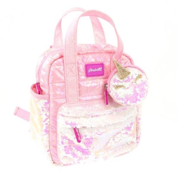 Plecak wykonany z miękkiej, opalizującej tkaniny, posiada cekinowe kieszenie z błyszczącymi kolorami. Plecak zawiera dodatkowo małą portmonetkę w kształcie jednorożca. Portmonetka posiada rówież haczyk, dzięki któremu możesz ją przymocować gdzie chcesz. Plecak ma 3 zewnętrzne kieszenie na ulubione przedmioty. Przednia kieszeń jest wyposażona w zamek błyskawiczny, natomiast dwie boczne kieszenie są otwarte. Główna komora jest wyposażona w zamek błyskawiczny i może pomieścić kilka przedmiotów, w tym pamiętniki, notatnik, długopisy, portfel, akcesoria i wiele innych. W górnej części są dwa praktyczne uchwyty.