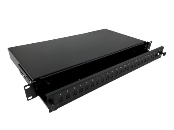 Panel światłowodowy z wysuwalną tacką do montażu w szafach i stojakach 19", 24 porty SC simplex, kolor czarny.