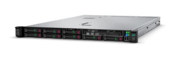 Serwer HPE ProLiant DL360 Gen10 do montażu w szafie serwerowej z jednym procesorem Intel Xeon 4208, pamięcią 32 GB, 4-portową kartą sieciową 10 Gb , 8 kieszeniami na dyski typu small form factor i jednym zasilaczem 800 W.
