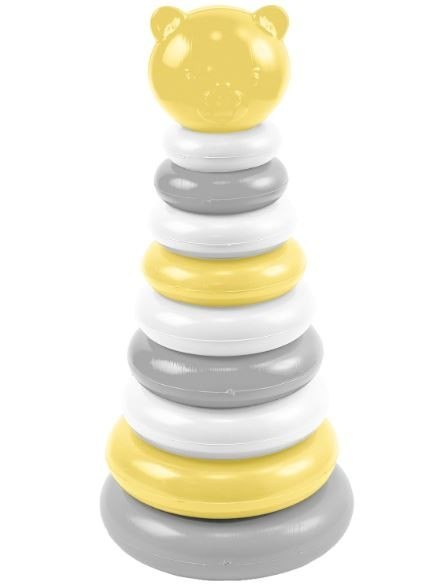 Misiowa Piramidka w kolorze żółto-biało-szarym składa się z podstawy ze słupkiem, na który dziecko nakłada różnej wielkości kółka, w kolejności od największego do najmniejszego, na końcu nakłada ostatni element, główkę misia, która wieńczy całą budowlę. Dziecko podczas zabawy ćwiczy precyzyjne ruchy dłoni, koordynację ręka-oko niezbędną do wykonywania podstawowych czynności oraz do nauki pisania i rozwija zmysł logicznego myślenia. W trakcie zabawy piramidką dziecko uczy się rozpoznawania kolorów i rozróżniania wielkości (małe, mniejsze, najmniejsze). Na kolorowych kółkach wchodzących w skład zestawu maluch będzie mógł potrenować umiejętność chwytania, tę bardzo podstawową, ale arcyważną umiejętność, dzięki której będzie mógł samodzielnie wykonywać wiele czynności takich jak np. picie czy jedzenie. Zestaw wyróżnia się jakością wykonania, oryginalną kolorystyką oraz estetycznym wyglądem.