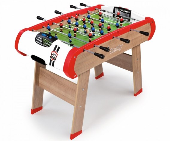 - Stabilny, drewniany stół z 4 blatami: gra w piłkarzyki, ping pong, cymbergaj oraz bilard, z akcesoriami do gry.