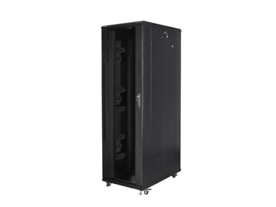 Szafa stojąca jednosekcyjna Lanberg FF01-8242-12B to rozwiązanie przeznaczone do budowy sieci, montażu okablowania oraz sprzętu w rozmiarze 19 o maksymalnym łącznym udźwigu do 800 kg. Może być stosowana w centrach danych, które wymagają dużej ilości miejsca w szafach na urządzenia. Szafa z powodzeniem spełni swoją rolę w dużych, rozbudowanych sieciach i serwerowniach, zarówno w małych, średnich jak i dużych firmach oraz korporacjach. Sprawdzi się również w instalacjach niskoprądowych takich jak sieci telewizji kablowych, systemy alarmowe, przeciwpożarowe, kontroli dostępu oraz systemy monitoringu CCTV i IP. Konstrukcja wykonana jest przy użyciu wysokiej jakości stali walcowanej, charakteryzuje się znakomitym designem i jakością wykonania. Szafa umożliwia pełną regulację głębokości pionowych szyn montażowych. Wyposażona jest w przednie drzwi ze szkła hartowanego z zamkiem, z możliwością montażu prawo lub lewo stronnego. Posiada zdejmowane boczne panele (z zamkami w zestawie) i tylne solidne stalowe drzwi z zamkiem. Istnieje możliwość wprowadzenia okablowania poprzez zamykany górny i dolny panel (z zaślepkami w zestawie). W zestawie znajduje się panel wentylacyjny z 4 wentylatorami 230V. Dodatkowo w komplecie załączone są akcesoria do mocowania szyn nośnych, śruby M6 oraz zaślepki paneli wejściowych, a dzięki konstrukcji do samodzielnego montażu (flat pack), całość znajduje się w 4 płaskich opakowaniach co ułatwia transport. W zestawie dołączony jest również pionowy organizer kabli.
