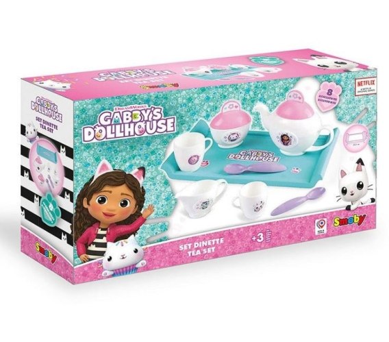 • Estetyczne naczynia dla lalek z wizerunkami postaci z bajki Koci domek Gabby pozwolą Twojemu dziecku będzie mogło dać upust swojej wyobraźni i bawić się godzinami, są tu taca do przenoszenia, 1 czajnik, 1 cukiernica, 1 dzbanek na mleko, 2 filiżanki i 2 łyżeczki.