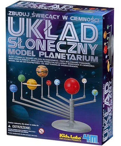 Złóż i polamuj model Układu Słonecznego. Przy malowaniu podkreśl niektóre elementy specjalną farbą dajacą efekt świecenia w ciemności. Model ma 30 cm rozpiętości.