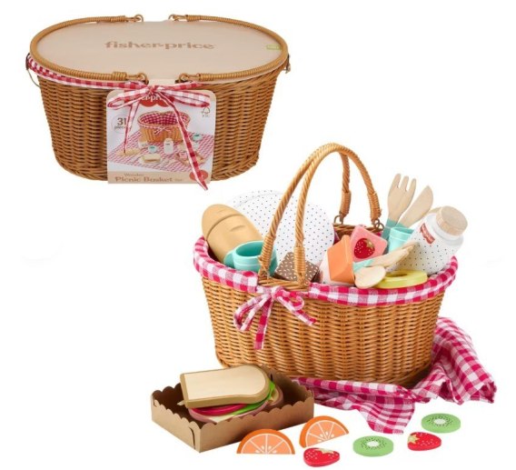 - 31 elementów! Zawiera kosz piknikowy, koc, tacę, pojemnik na napoje, 2 kubki, 2 talerze, 6 przyborów i 17 zabawek w postaci jedzenia, w tym owoce, ser, chleb i wiele innych