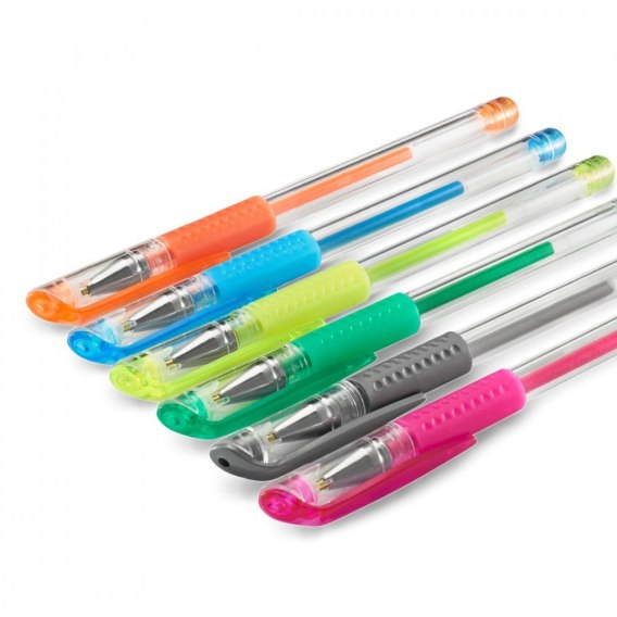 Zestaw składa się z długopisów w 6 kolorach: niebieskim, pomarańczowym, różowym, srebrnym, zielonym i żółtym, w neonowych odcieniach. Pisaki doskonale sprawdzą się do kreatywnych prac, takich jak ozdabianie albumu ze zdjęciami czy wypisywania kartek z życzeniami.