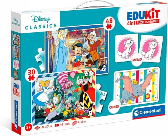 - Zawiera puzzle 30 elementów i 48 elementów, grę memo i sześć kostek.