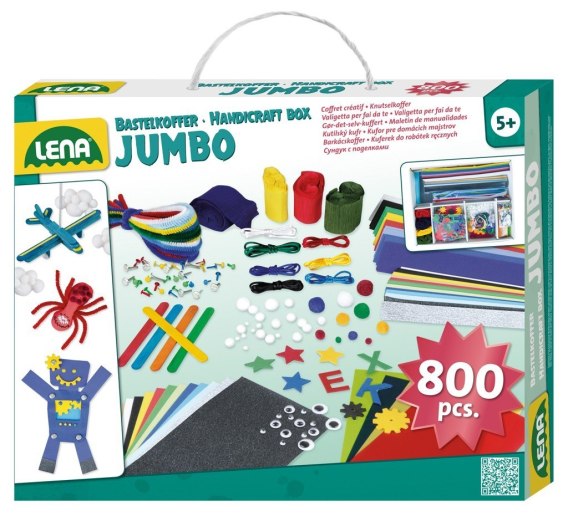 Walizka rzemieślnicza LENA Jumbo Niebieska zawiera materiały do kreatywnej zabawy, takie jak: kolorowy papier, elementy z gumy piankowej, chybotliwe oczy, pomponiki, patyczki do lodów, styropianowe kulki, wstążki i wiele innych. Walizka zawiera aż 800 elementów. Zestaw odpowiedni dla dzieci powyżej 5 roku życia.