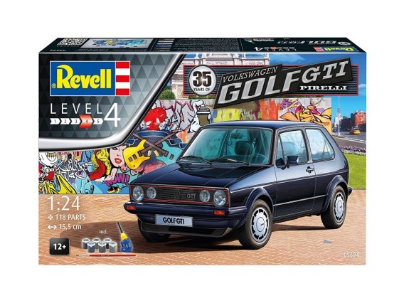 W zestawie znajduje się model niemieckiego samochodu kompaktowego VW Golf pierwszej generacji, 6 podstawowych farbek, pędzelek oraz klej.