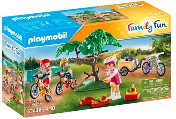 Wyrusz już teraz na wspaniałą wycieczkę rowerową z całą rodziną. Szczegółowo zaprojektowany zestaw do zabawy PLAYMOBIL zawiera dodatki potrzebne do długich wycieczek rowerowych odbywających się w pokoju dziecięcym: trzy rowery, kaski, plecak, prowiant i inne wspaniałe akcesoria.Dla bezpieczeństwa każda z figurek zakłada kask. Liczne elementy wyposażenia można przechowywać w przyczepce rowerowej i zabezpieczyć silikonowym paskiem. Zestawy z serii Kemping PLAYMOBIL zapraszają dzieci w wieku od 4 lat do przeżycia wymarzonych wakacji w domu. Wspaniała zabawa samemu lub z przyjaciółmi. Możliwość połączenia z innymi zestawami z serii PLAYMOBIL Family Fun.